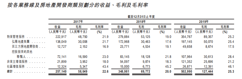 公开数据显示,2019年,弘阳服务来自第三方房地产开发商的毛利率由2018年的19.1%降至17.5%,招股书表示,这是由于收购标的南京亚东物业管理的住宅物业管理费用较低,弘阳服务住宅物业的平均物业费由2018年的1.57元/平方米减少至2019年的1.54元/平方米。