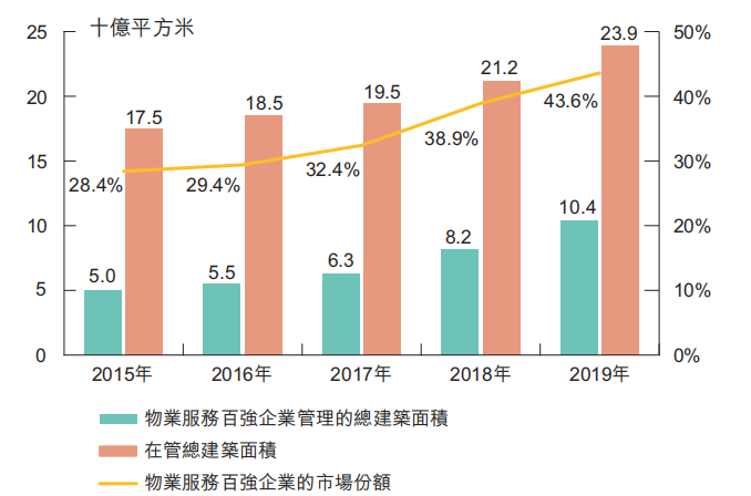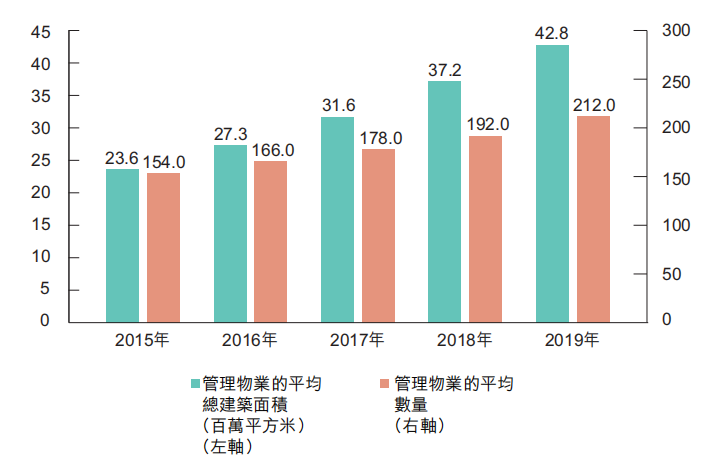 近年来,随着城镇化进程加快和人均可支配收入持续增加,物业服务百强企业管理的建筑 面积和物业数量快速增长。根据中指院的资料,物业服务百强企业所管理物业的平均总建筑面积由截至2015年12月31日的约23.6百万平方米增至截至2019年12月31日的约42.8百万平方米,复合年增长率为16.0%。根据中指院的资料,物业服务百强企业所管理物业的平均数量由截 至2015年12月31日的154项增至截至2019年12月31日的212项,复合年增长率为8.3%。