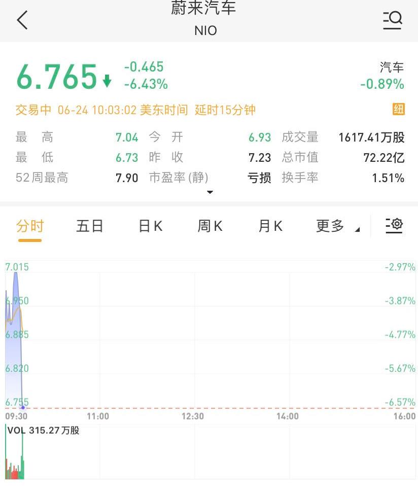华盛资讯6月24日消息,美股盘初,蔚来(NIO.US)开盘后股价跳水,截至北京时间21:59,跌7.33%,报6.70美元。