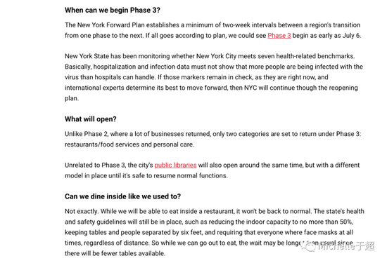 随着纽约市这周正式进入复工第二阶段,大家会担心疫情是否会反弹。纽约市二阶段复工领域包括零售店、理发店、写字楼、汽车销售、清洁、部分餐厅可以室外就餐等。二阶段就有接近30万人会重返工作岗位。如果一切顺利的话,纽约市最早可于7月6日,即美国国庆节后首个周一进入三阶段重启。