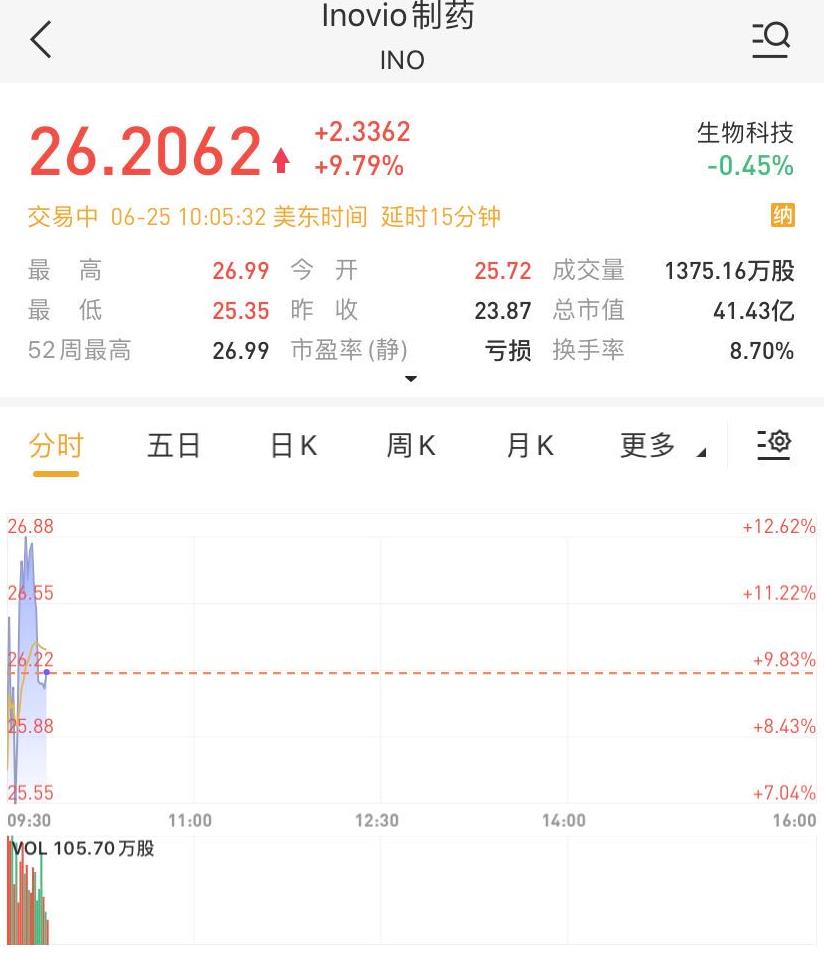 华盛资讯6月25日消息,Inovio制药昨日上涨之后,今日继续暴涨,截至北京时间21:57,涨15%,报27.45美元。