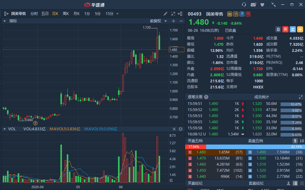 这样的涨幅让人看起来十分振奋,但在这样的大幅上涨后,国美零售(周三)收盘价也仅仅是1.62港元/股,总市值达349.23亿港元。