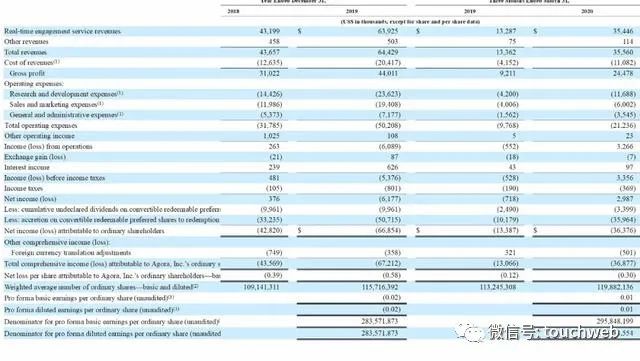 声网Agora2018年、2019年净利分别为38万美元、-618万美元;2020年第一季度净利为298万美元,上年同期的净亏损为72万美元。