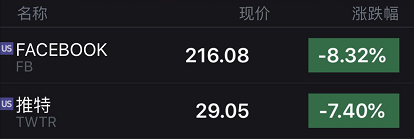 截至本周五收盘,脸书股价大跌8.32%,市值蒸发约558亿美元。推特股价也跌了7.40%,市值蒸发约18亿美元。