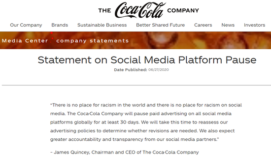 “从7月1日开始,可口可乐公司将在全球所有社交媒体平台上暂停付费广告至少30天。”可口可乐公司首席执行官詹姆斯·昆西(James Quincey)在品牌网站上发布的声明中写道。“我们将利用这段时间重新评估我们的广告标准和政策,以确定是否需要在内部进行修订,以及我们应该对我们的社交媒体合作伙伴提出更多的期望,以消除平台上的仇恨、暴力和不当内容。”
