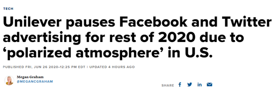 联合利华公司的声明称:“鉴于我们的责任以及美国国内两极对立的气氛,我们决定至少到今年年底前,我们将不在美国的社交媒体新闻平台脸书、Instagram和推特上投放品牌广告”,“当前继续在这些平台上做广告不会为人们和社会增加价值”。