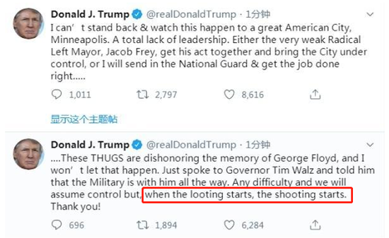 特朗普此后同时在社交平台上针对示威活动发帖,称“一旦发生抢劫,那么就开始枪击”。这一帖子很快被推特标记为“美化暴力”,而脸书当时并未对帖子采取任何行动。