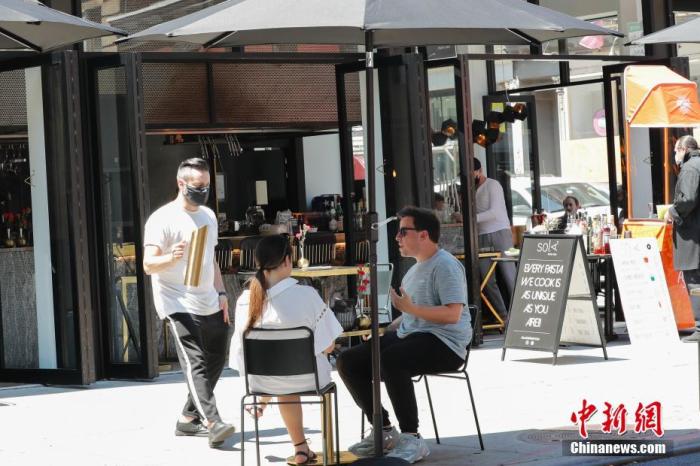 当地时间6月22日,纽约曼哈顿一家餐厅,顾客在户外用餐。当日,纽约市按预定计划进入第二阶段重启,市政府预计将有约30万人重返工作岗位。中新社记者 廖攀 摄