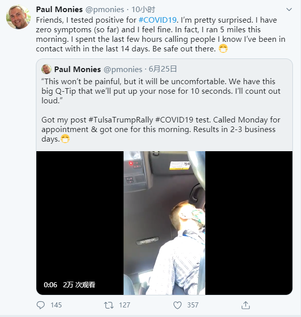 莫妮斯表示,他不确定自己是否是在此前特朗普的塔尔萨竞选集会上感染了新冠病毒,目前也尚未追踪到他是通过与谁接触感染了病毒。“我花了几个小时联系曾在室内接触过的所有人,还有附近的几个朋友,我觉得我有责任告诉他们我的检测结果。”