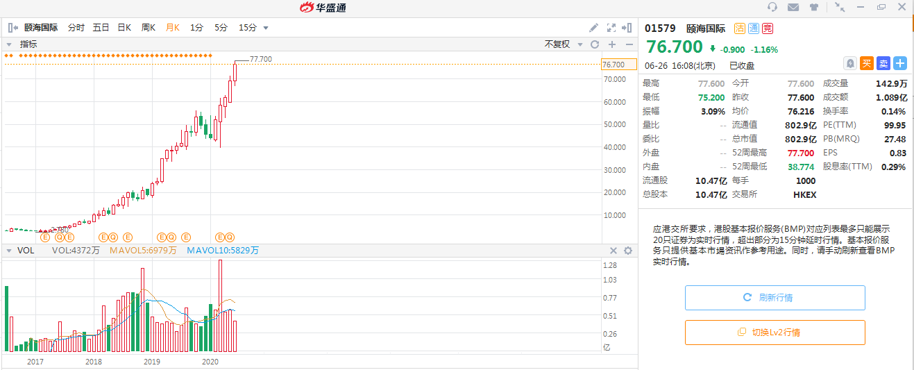 有一家公司在2016年7月港股市场上市之时,股票发行价仅有3.3港元,但经过4年时间这家公司股价已经暴涨至最高77港元水平,区间最大涨幅超过23倍!