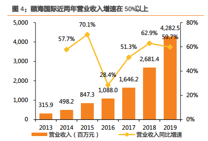 2019年颐海国际营业收入达到42.8亿元,同比增长为59.7%;在2013年其营收仅为3.16亿元,6年的时间颐海国际营收规模增长达12.55倍,在2013年至2019年颐海国际营收年复合增长率达到54.4%。