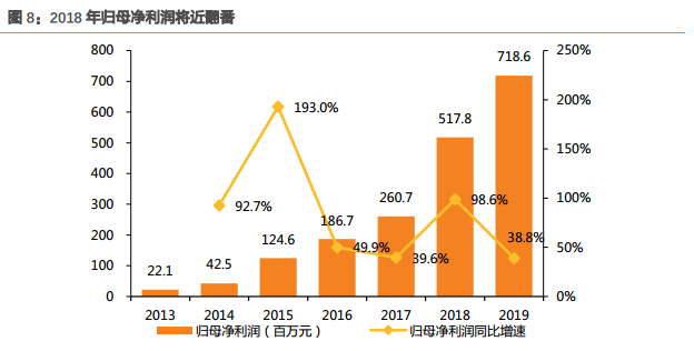 颐海国际的净利润增长比营收增长幅度更大,2019年颐海国际归母净利润达7.2亿元,相较于2013年归母净利润2210万元,6年时间增长31.5倍,2013年-2019年归母净利润年化复合增长率达78.7%。
