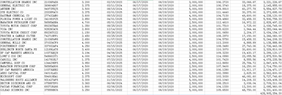 本月美联储购买的“个别”公司债中,按照购买金额排名前十的公司为康卡斯特、艾伯维(ABBvie)、AT&T、联合保险、可口可乐、SABINE PASS LIQUEFACTION、沃尔玛、伯克希尔-哈撒韦、微软和PROLOGIS LP。