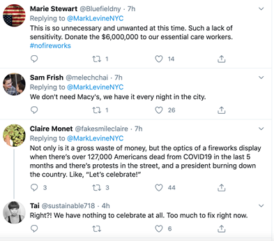 此举在社交网络上引起市民的强烈反对。大家纷纷表示:“烟火庆祝表演在此刻是完全不必要且不受欢迎的,请把这花费的6百万美元捐给医疗工作者。12.7万美国人在过去5个月中死于新冠,我们没有任何可庆祝的。”