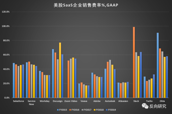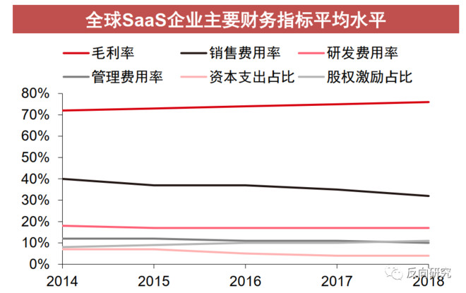 所以,这里就产生一个现象,即使是再强的SaaS企业,都需要产生非常大比例的销售费用。根据中信证券的研究,2014-2018年全球SaaS企业的销售费率出于30-40%区间。