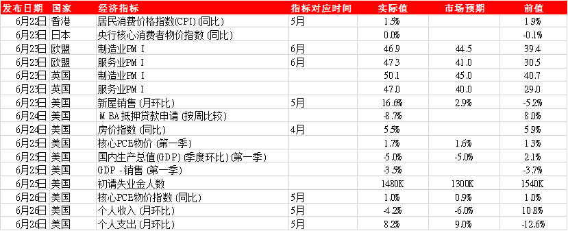 另外,上周公布的经济数据也表现不俗。美国5月份零售额较前一个月猛增17.7%,是1992年开始有数据以来的最高增幅,远超预期的8.0%。欧元区6月 ZEW经济景气指数急升至58.6,创5年来新高,德国6月ZEW经济景气指数也创下14年新高63.4,胜于预期的60。惟美国上周初请失业金人数仅轻微下降,表现不济预期。整体而言,近期的数据确实印证了市场原先对于经济见底的预期。