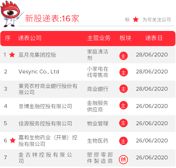过去一周多达16只新股港股递交上市申请,大批企业趁Q2结束之前冲刺港交所,新股题材极为丰富,不仅有知名企业蓝月亮、医药公司嘉和生物等等。