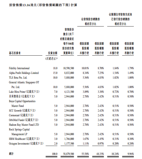 那么能不能申购欧康维视呢?看基石投资者是一个重要参考指标。本次欧康维视获得了14家知名机构作为基石投资,投资总额达1亿美元(约7.75亿港元),如果超额配售权未获行使,那么将占据欧康维视总发售股份的55.58%。