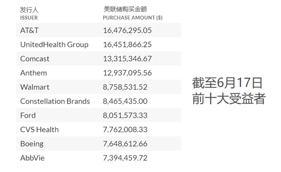 周日,美联储公布了二级市场企业信贷便利工具 (SMCCF) 的使用情况,这是自6月16日修改购债策略后的首次披露。其中,AT&T (电信)、联合健康 (保险)、康卡斯特 (有线) 位列三甲;福特、波音、可口可乐、沃尔玛以及巴菲特的伯克希尔等企业债的持有量也居前。