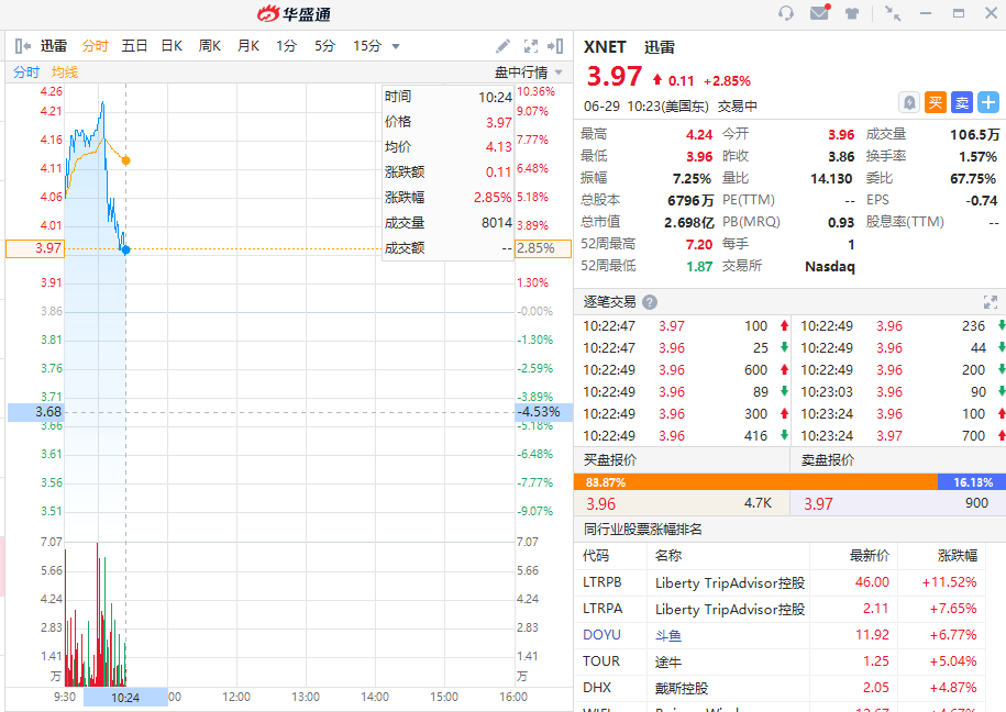 华盛资讯6月29日消息,迅雷(XNET.US)上涨2.85%,截至北京时间22:24,涨2.85%,报3.97美元。
