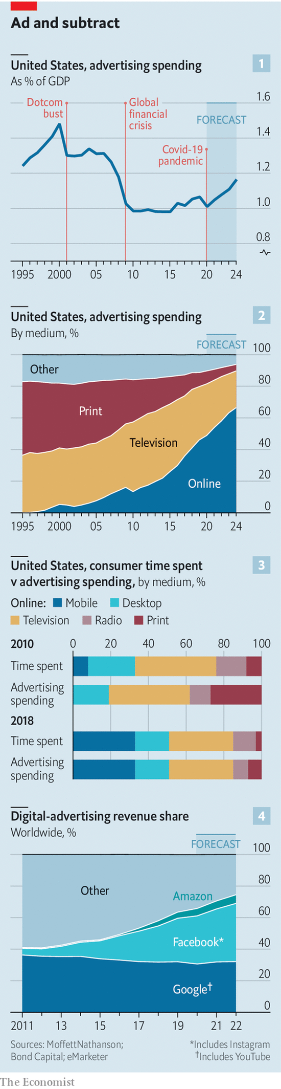 尽管如此,今年的广告开支降幅可能将小于2009年金融危机后11.2%的降幅。研究公司MoffettNathanson认为,虽然2001年和2009年经济衰退期间损失的大部分广告收入再也没有回来,但这一次有所不同:最早到明年,广告开支就能恢复到疫情之前的水平(图1)。为什么呢?这还要得益于互联网。