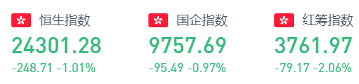 周一收盘,恒生指数跌248.71点或1.01%,报24301.28点,全日成交额达1330.19亿。国企指数跌0.97%,报9757.69点,红筹指数跌2.06%,报3761.97点。