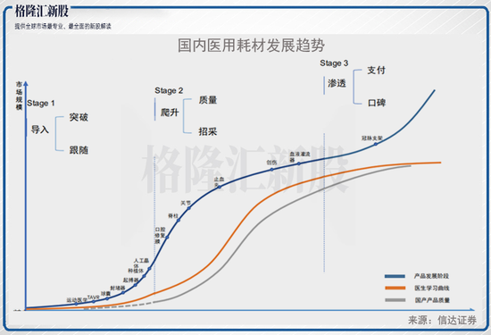 不过,从另一方面的投资逻辑上来看,如果从将整个国内医用耗材的市场规模与时间进行做图,将国产的产品质量、发展阶段以及医生学习曲线进行叠加,我们可以看到,国内医用耗材发展实际上是呈现三大阶段挖掘投资的机会: