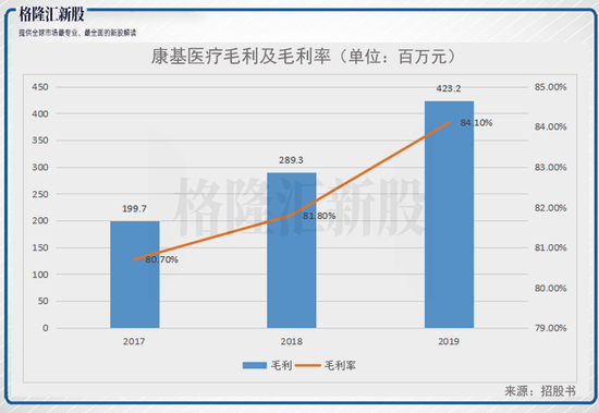 从毛利上来看,康基医疗的毛利由2017年的人民币1.2亿元增至2018年的人民币2.89亿元,并进一步增至2019年的人民币4.23亿元,年复合增长率为45.6%。毛利率由2017年的80.7%增至2018年的81.8%,并进一步增至2019年的84.1%。