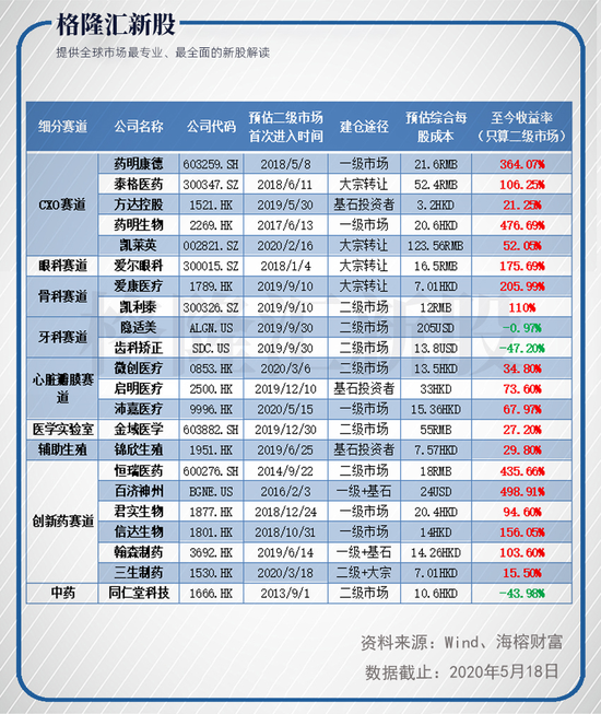 其实,高瓴投资的生物医药相关公司不止这三家,按照公开资料统计,目前高瓴资本在一级市场以及二级市场布局的医药生物赛道包括:CXO、眼科、骨科、牙科、心脏瓣膜、医学实验室、辅助生殖、创新药以及中药等。不完全统计,至2020年5月18日,高瓴资本布局的医药股多达22家,绝大多数公司都为高瓴取得了丰厚的回报。