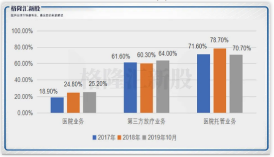 从毛利率角度来看,三项业务中医院业务以及第三方放疗业务毛利率逐年递增。公司的医院业务毛利率由2017年的18.9%增长至2019年10月的25.2%,第三方放疗业务毛利率由61.6%增长至64%。但医院托管业务的毛利率在2019年10月有所下滑,从上一年的78.7%下滑至70.7%。