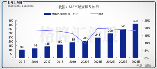 从市场规模上来看,微创外科手术器械及配套耗材(MISIA)是微创外科手术(MIS)中使用的主要医疗器械(不包括内窥镜),它的销售收入从2015年的人民币96亿元增加到2019年的人民币185亿元,年复合增长率达17.8%,未来,根据CIC预测自2019年起的年复合增长率将为17.2%,到2024年将达到人民币408亿元。