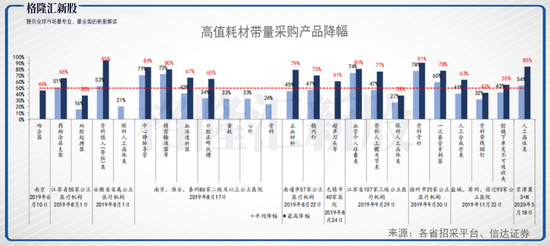 高值耗材的带量采购,主要设及产品包括:吻合器、起搏器、支架、骨科、人工晶体、血透、口腔耗材等产品,从过往各地的价格降幅来看,最高降幅达到95%,平均降幅大多低于50%。