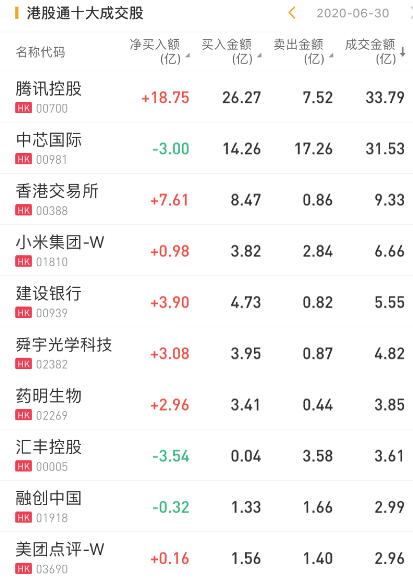 今日,南下资金净买入腾讯控股18.75亿港元,净买入港交所7.61亿港元,净买入建设银行3.90亿港元,净买入舜宇光学科技3.08亿港元。此外,南下资金今日净卖出汇丰控股3.54亿港元。