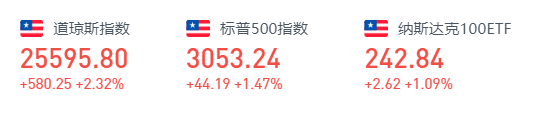 截至收盘,道指涨580.25点,报25595.80点,涨幅为2.32%;纳指涨116.93点,报9874.15点,涨幅为1.2%;标普500指数涨44.19点,报3053.24点,涨幅为1.47%。
