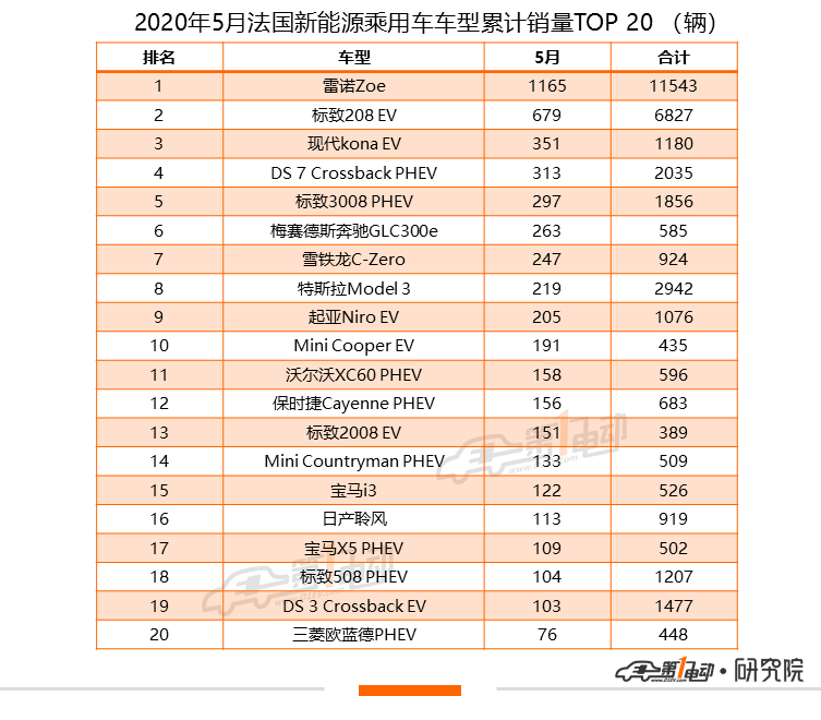 根据EVSavles数据,随着法国汽车市场的缓慢恢复,新能源乘用车市场交付量也随着上涨。5月交付量为7,167辆,环比大涨335.4%,同比上涨77%。新能源乘用车市场渗透率在5月为7.4%,其中纯电动车型占比4.3%,2020年前五个月来看,渗透率水平为9.2%,其中纯电动车型占比6.5%,远超2019年的2.8%。