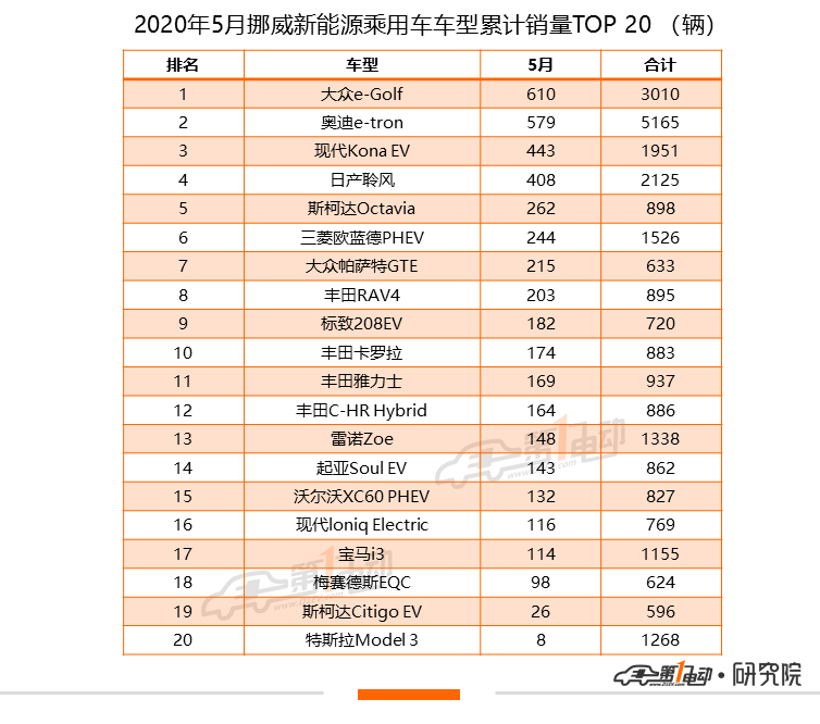 根据EVSales数据,2020年5月,包含纯电动车型及插电式混合动力车型的挪威新能源乘用车销量达7,998辆,较上月上涨7.7%。5月,新能源乘用车在挪威市场的渗透率为66%,较上月下滑4个百分点,其中纯电动车型市场占比为43%。全年来看,新能源汽车市场占有率为69%,其中纯电动车型市场占比为49% 。