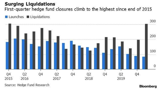对冲基金研究公司(Hedge Fund Research)周二报告称,今年一季度全球有304只基金清算,创下2015年第四季度305只基金倒闭以来的最高水平。HFR数据显示,倒闭的基金的数量比2019年最后三个月增加了50%,当时有198只基金被清算。
