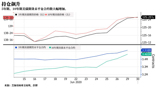 5年期债券期货未平仓合约在过去5个交易日里增加逾12万张,这相当于大约130亿美元的现金债券。还有7年到期的10年期债券期货未平仓合约增加了近18万张,相当于230亿美元的现金债券。
