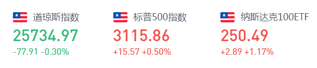 截至收盘,道指收盘下跌77.91点或0.30%,报25734.97点;纳指涨95.86点或0.95%,报10154.63点,创历史新高;标普500指数涨15.57点或0.50%,报3115.86点。