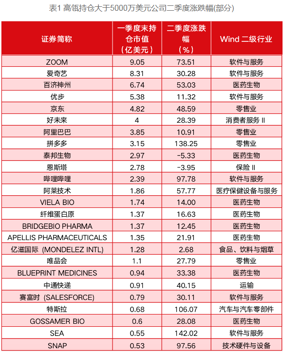 高瓴资本2020年一季度美股持仓组合在二季度显著“领跑”大市。其中,多只“重仓股”在二季度实现翻倍走势。若高瓴二季度持仓和一季度持仓保持一致,其二季度或实现超30亿美元浮盈,持仓市值增长40%。