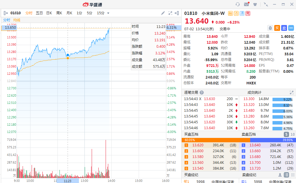新浪港股讯 7月2日消息,小米午后涨幅扩大至6%,最新报13.64港元,市值3283亿港元。