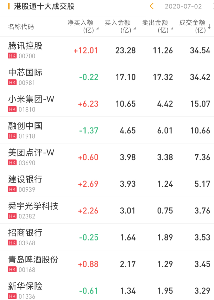 净买入额方面,南下资金净买入腾讯控股122.01亿港元,净买入小米集团6.23亿港元,净买入建设银行2.69亿港元,净买入舜宇光学科技2.26亿港元。此外,南下资金今日净卖出融创中国1.37亿港元。