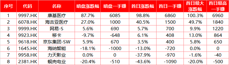 首先来看看暗盘数据,在8只新股中有4只暗盘收市一手可赚670港元以上,相较于上个月的1200港元有所下降。其中暗盘收市收益的前三名为康基医疗、海吉亚医疗以及网易-S,收益分别为6085港元、1000港元、690港元。