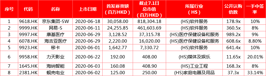 2020年6月份,港股市场回暖上涨,恒生指数全月上涨6.38%。6月港股新股市场总共有8家公司挂牌上市,总募资额为617.8亿港元,相较5月的66.87亿港元暴增550亿港元。这主要是由于知名中概股京东和网易赴港二次上市的原因。6月的新股市场尽管上市公司数量不多,但投资亮点却不少。
