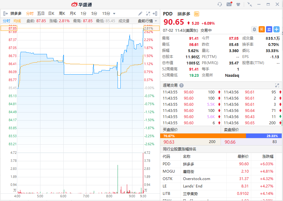华盛资讯7月2日消息,拼多多盘中(PDD.US)上涨超6%。截至北京时间23:43,涨6.09%,报90.65美元。