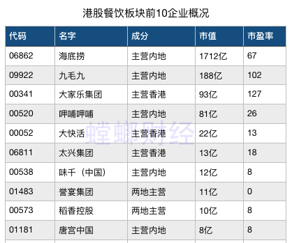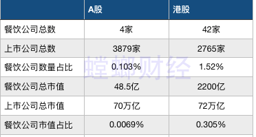 截止至6月29日,在A股上市的餐饮公司只有4家,分别是全聚德(002186.SZ)、西安饮食(000721.SZ)、ST云网(002306.SZ),以及一家准备上市的同庆楼。已经上市的3家餐饮公司的总市值为48.5亿元,占A股总市值的0.0069%。在港股上市的餐饮公司有42家,看着虽然多,但除去仙股仅剩下10家,但总市值就要大很多,截止至6月29日,42家餐饮公司的总市值约为2200亿港元,占港股总市值的0.305%。