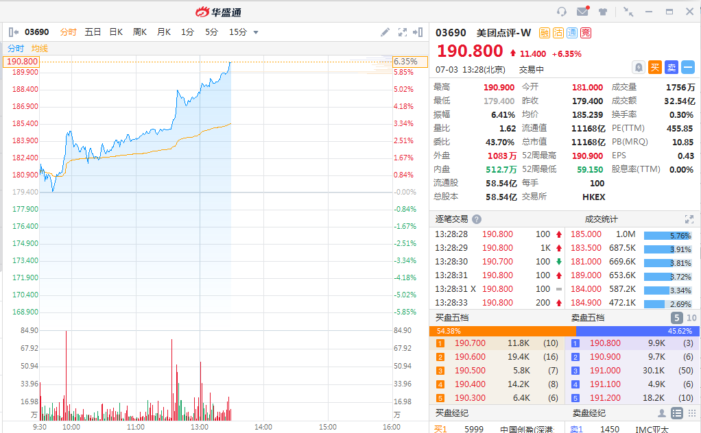 新浪港股讯 7月3日消息,美团点评午后涨幅扩大至6%,最高见190港元,总市值为11122.6港元,折合1435亿美元,超过中国移动,成为港股第七大市值公司。