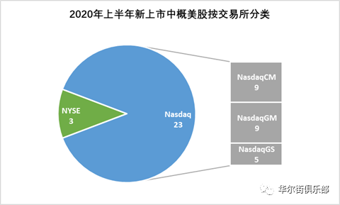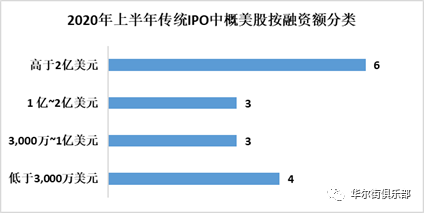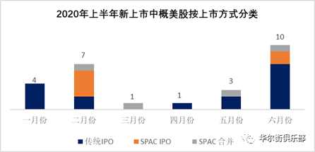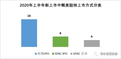 2020年上半年共计有26家中概股登陆美国资本市场,数量超过去年同期的23家。其中16家通过传统IPO,6家通过SPAC(特殊目的公司并购)IPO,4家通过SPAC合并完成上市。和去年同期一样没有中概股通过转板(up-listing)在主板上市成功。