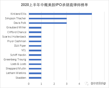 上半年比较活跃的承销商律所是Kirkland & Ellis (5),Davis & Polk (2),Simpson Thatcher (2), 总共占据了16家IPO的56.3%。其余7家律所各做了一个IPO承销商律师。下图是具体数据分布: