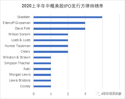 Skadden,Arps, Slate, Meagher & Flom (“Skadden”) 今年上半年服务了16家IPO中的4家公司,即25%市场份额。其后的发行方律所是Davis Polk (3), Cleary (2), Hunter Taubman (2)。下图是具体数据分布: